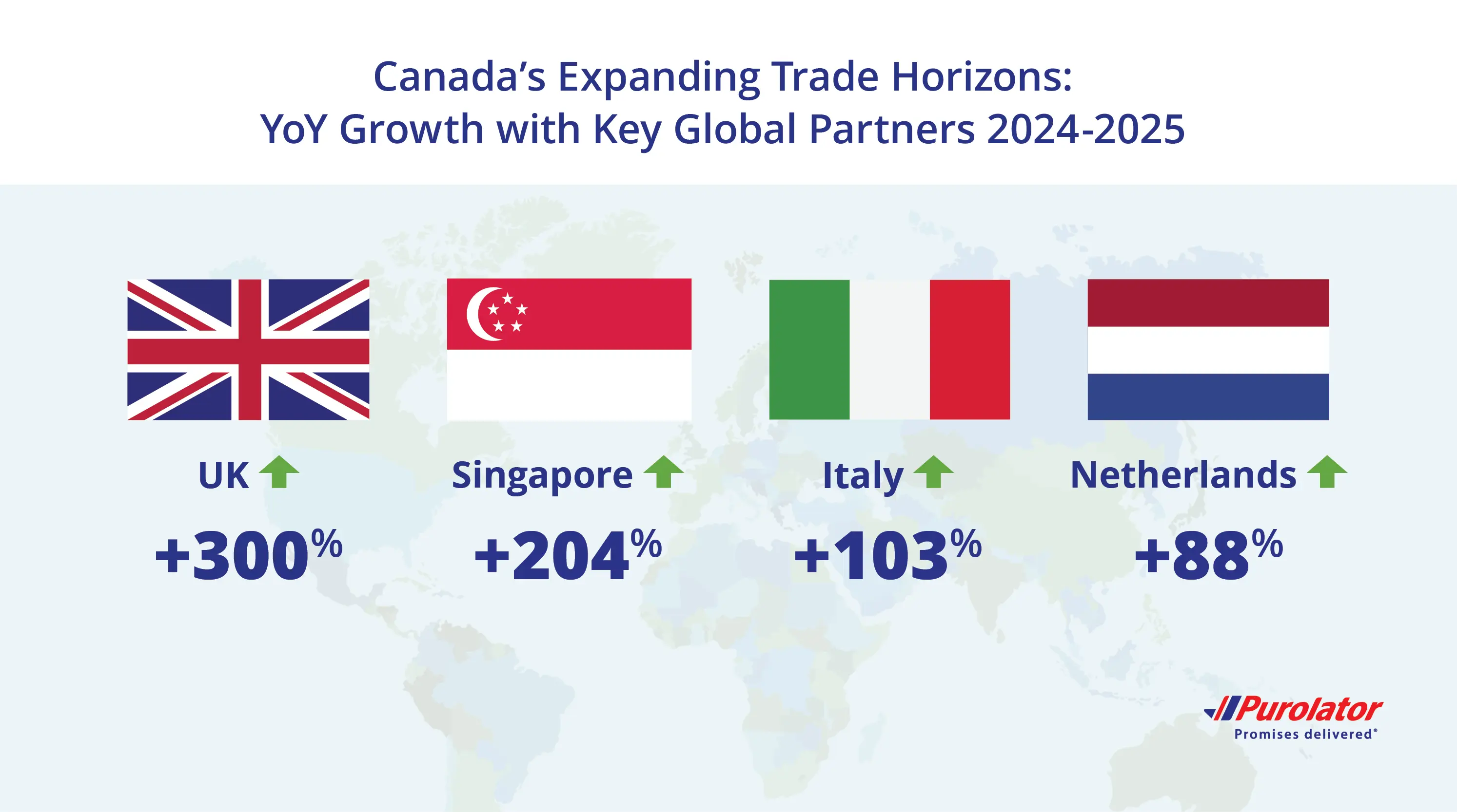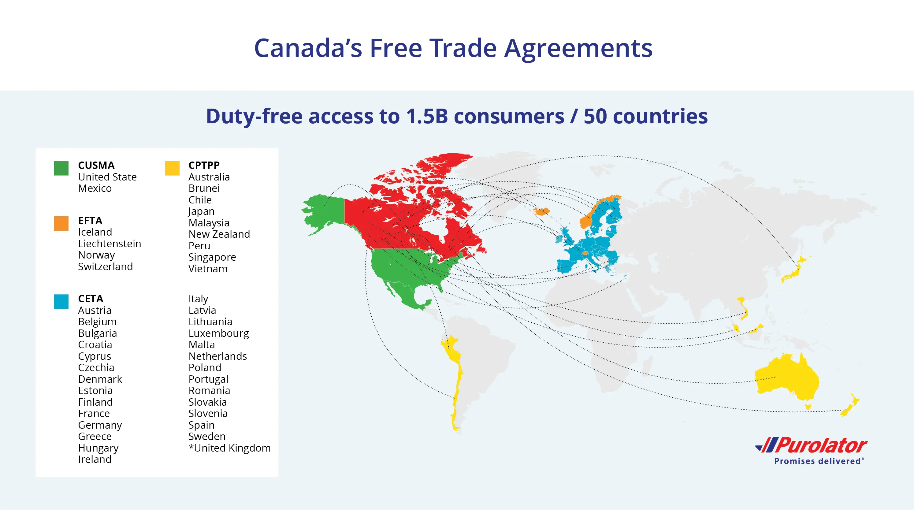 Upon arrival in North America, shipments remain in Purolator’s network for final delivery throughout Canada and the United States.