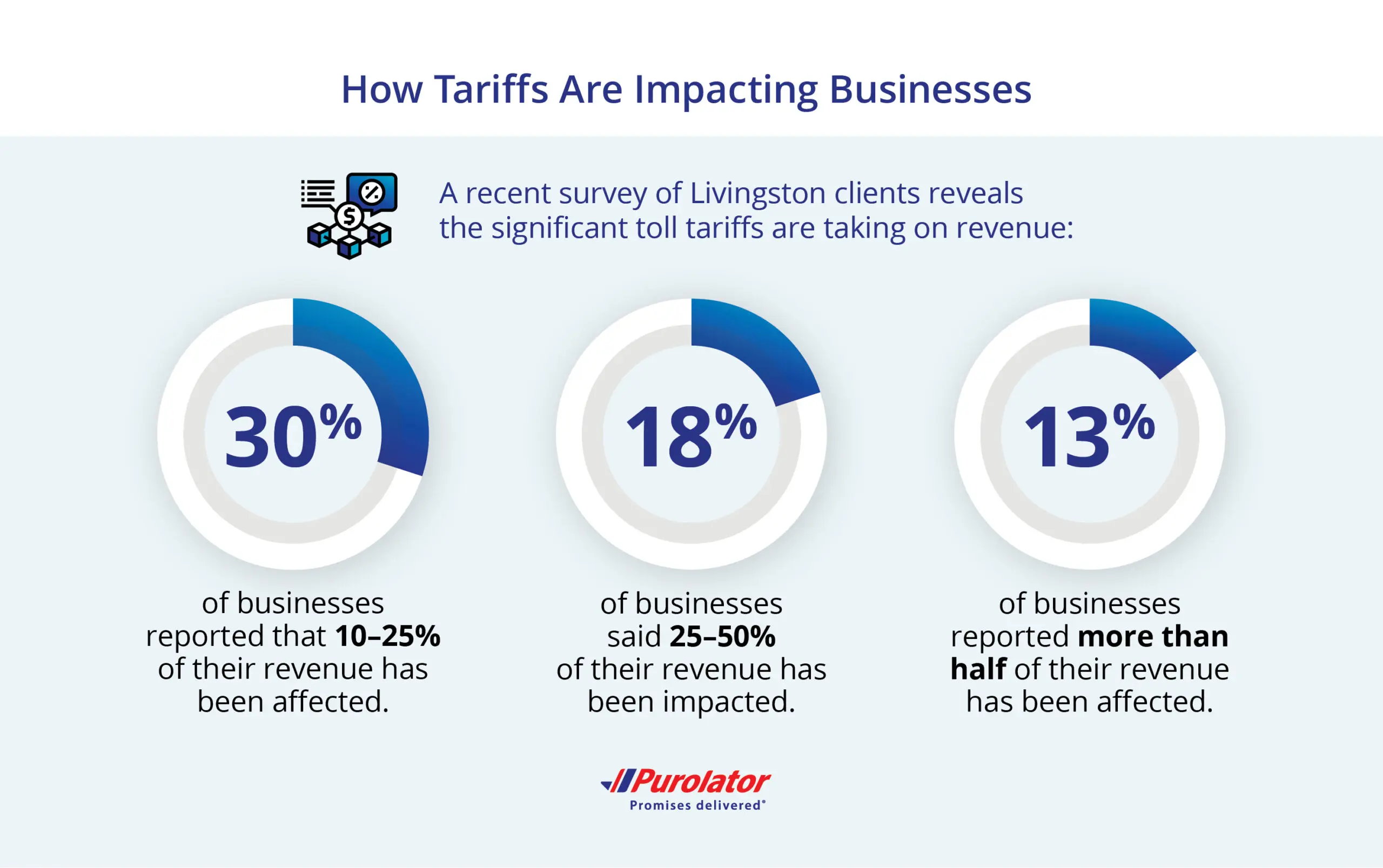 Hurley, along with Livingston colleague Jeff Fraser recently joined Purolator colleagues for a series of webinars in which they detailed several duty mitigation strategies available to U.S. and Canadian businesses. An early-April survey of Livingston clients found the tariff increases have already started to take a toll. A few findings include: