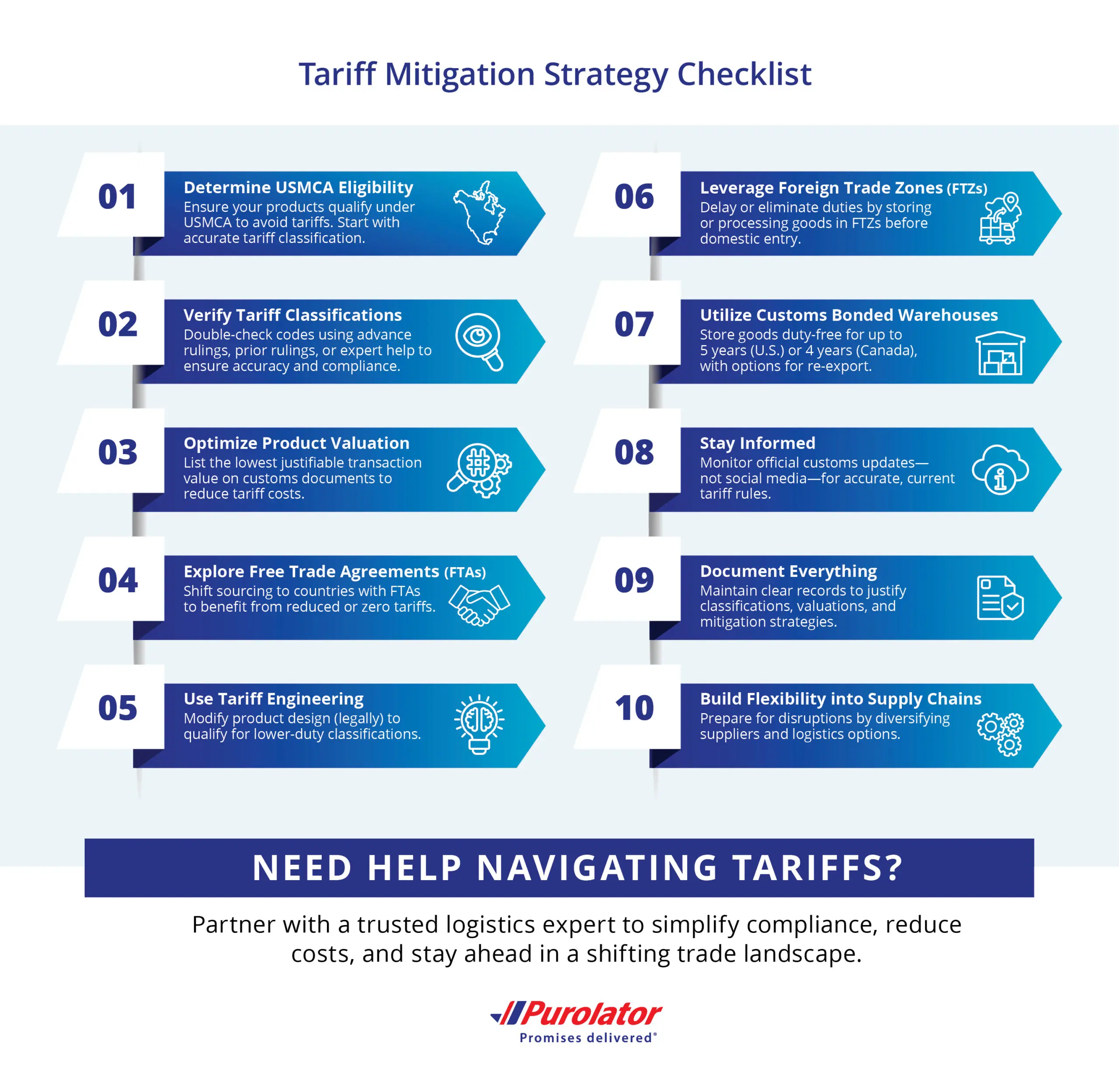 As this overview makes clear, shippers have options available to help to manage fallout from the current trade war. In deciding which strategy makes the most sense though, a business will need to carefully assess its unique situation and weigh the pros and cons of each option. In doing so, keep in mind a few pieces of advice offered by Livingston trade experts during the recent Livingston/Purolator webinars: