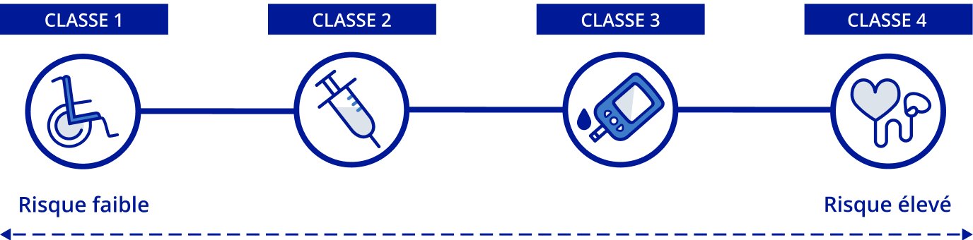 • Santé Canada catégorise les dispositifs en fonction du risque associé à leur utilisation. Les dispositifs sont classés en quatre classes distinctes, les dispositifs de classe I présentant le risque le plus faible (p. ex., thermomètre ou abaisse-langue) et les dispositifs de classe IV présentant le risque le plus élevé (p. ex., stimulateur cardiaque).