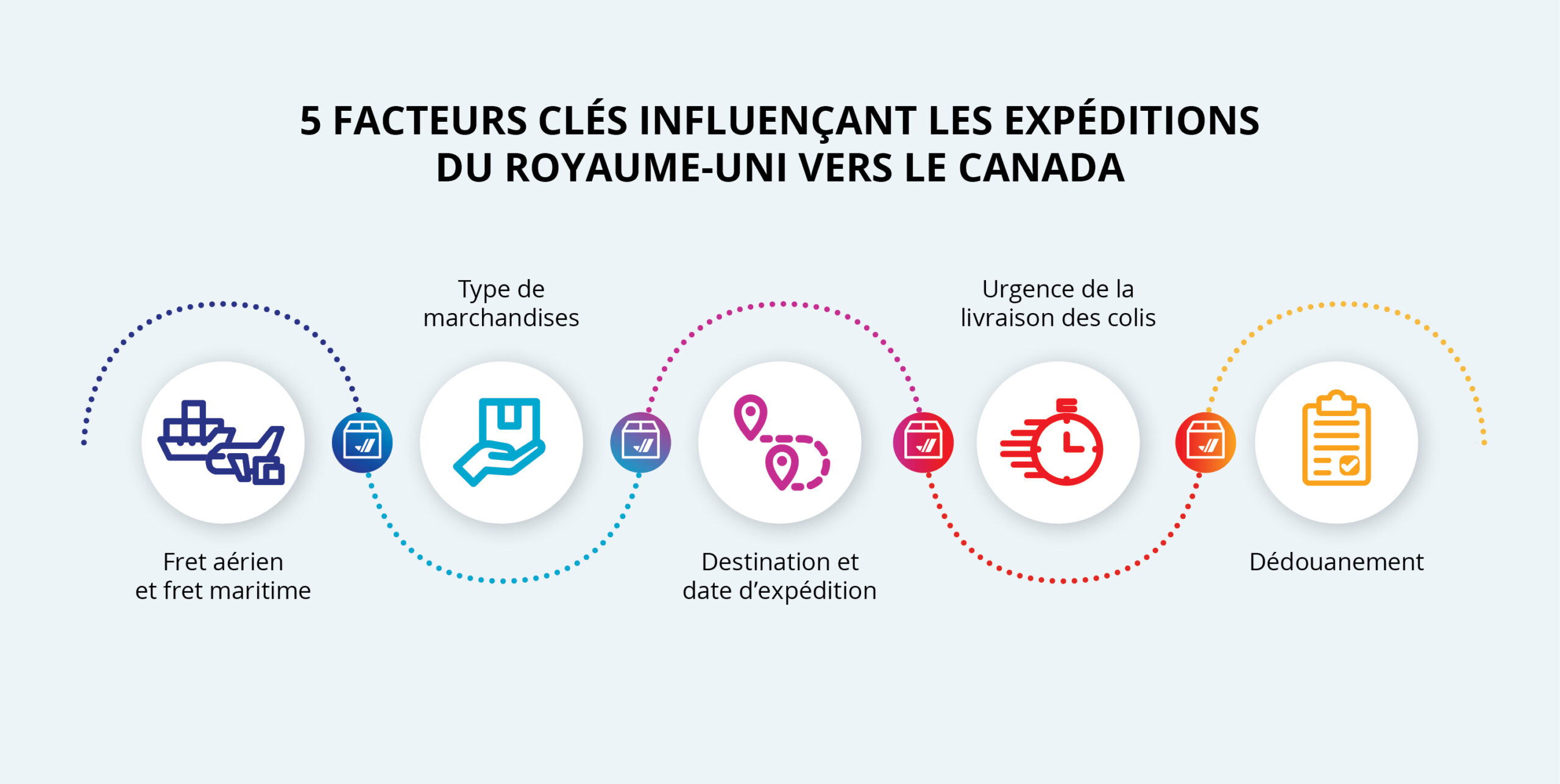 - Choisissez le bon service d’expédition. Cherchez un service de qualité et des solutions de logistique transfrontalières entre le Canada et le Royaume-Uni qui soutiennent tous les aspects du parcours de votre envoi, comme les services d’agents transitaires internationaux, les services pour les envois de chargement partiel (LTL) et de chargement complet (TL) transfrontaliers et plus encore.