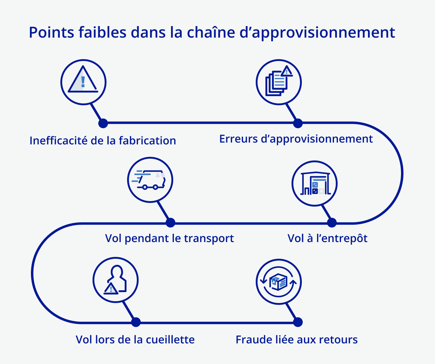 Une fraude peut se produire à n’importe quelle étape de la chaîne d’approvisionnement et les frais peuvent être astronomiques pour les entreprises. Le remplacement des produits volés ou endommagés est non seulement onéreux, mais il réduit l’efficacité et exige des efforts supplémentaires en matière de planification, d’approvisionnement, de temps et d’administration. Afin de prévenir les pertes, il est utile de comprendre ce qui rend une chaîne d’approvisionnement vulnérable et comment se protéger en conséquence.