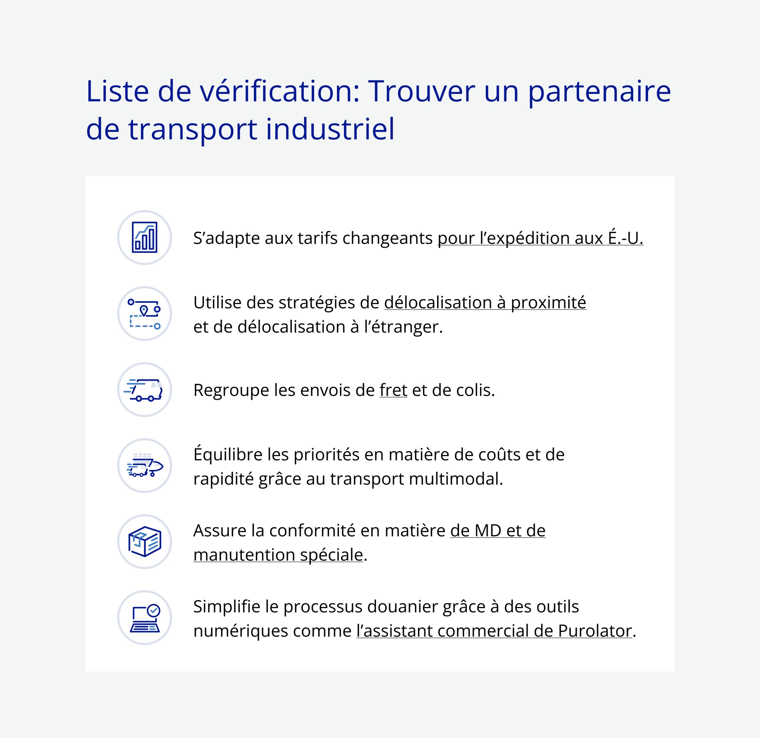 En faisant affaire avec Purolator, votre entreprise obtient bien plus qu’un simple transporteur. Elle peut compter sur un partenaire de confiance qui est outillé pour améliorer la fiabilité de la chaîne d’approvisionnement, simplifier les échéanciers des projets et aider à gérer les coûts de transport sans compromettre le service.