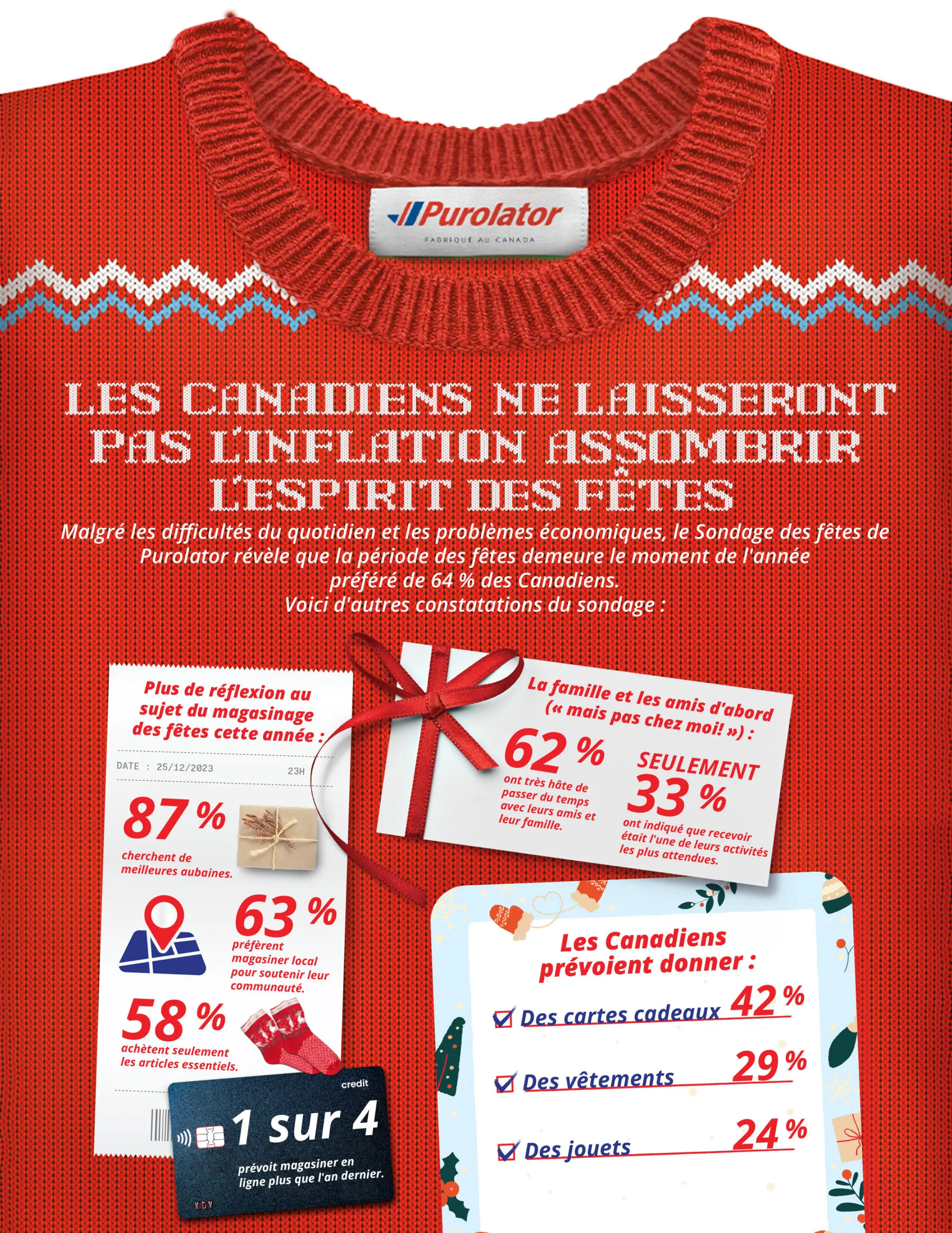 Dans le cadre de notre dernier sondage mené en partenariat avec Leger, nous avons interrogé plus de 3 000 personnes du Canada et des États-Unis afin de connaître leurs attentes et leur état psychologique en cette période des fêtes. Des facteurs de stress aux budgets en passant par les expériences de magasinage et les attentes, les gens du Canada et des États-Unis voient les choses de la même façon durant la période des fêtes : ils veulent réduire leur budget, magasiner localement, magasiner en ligne et réduire le stress lié aux expériences de magasinage pour les fêtes.