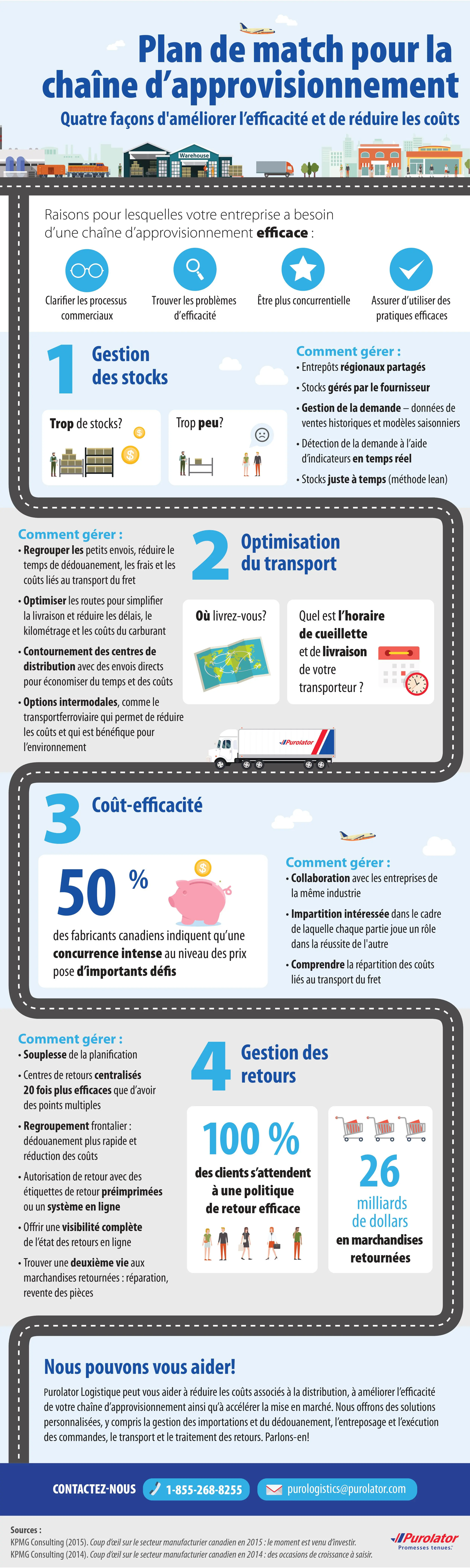 Téléchargez l'infographie Les solutions personnalisées de Purolator et la vaste couverture du réseau canadien peuvent vous aider à faire avancer votre chaîne d’approvisionnement. Nous contacter Partager: Share post on LinkedIn Share post on Twitter Share post on Facebook Share post via email Article précédent: Plan de match pour la gestion de la chaîne d’approvisionnement Article suivant: Purolator innove avec ses camions afin d’améliorer l’expérience du client