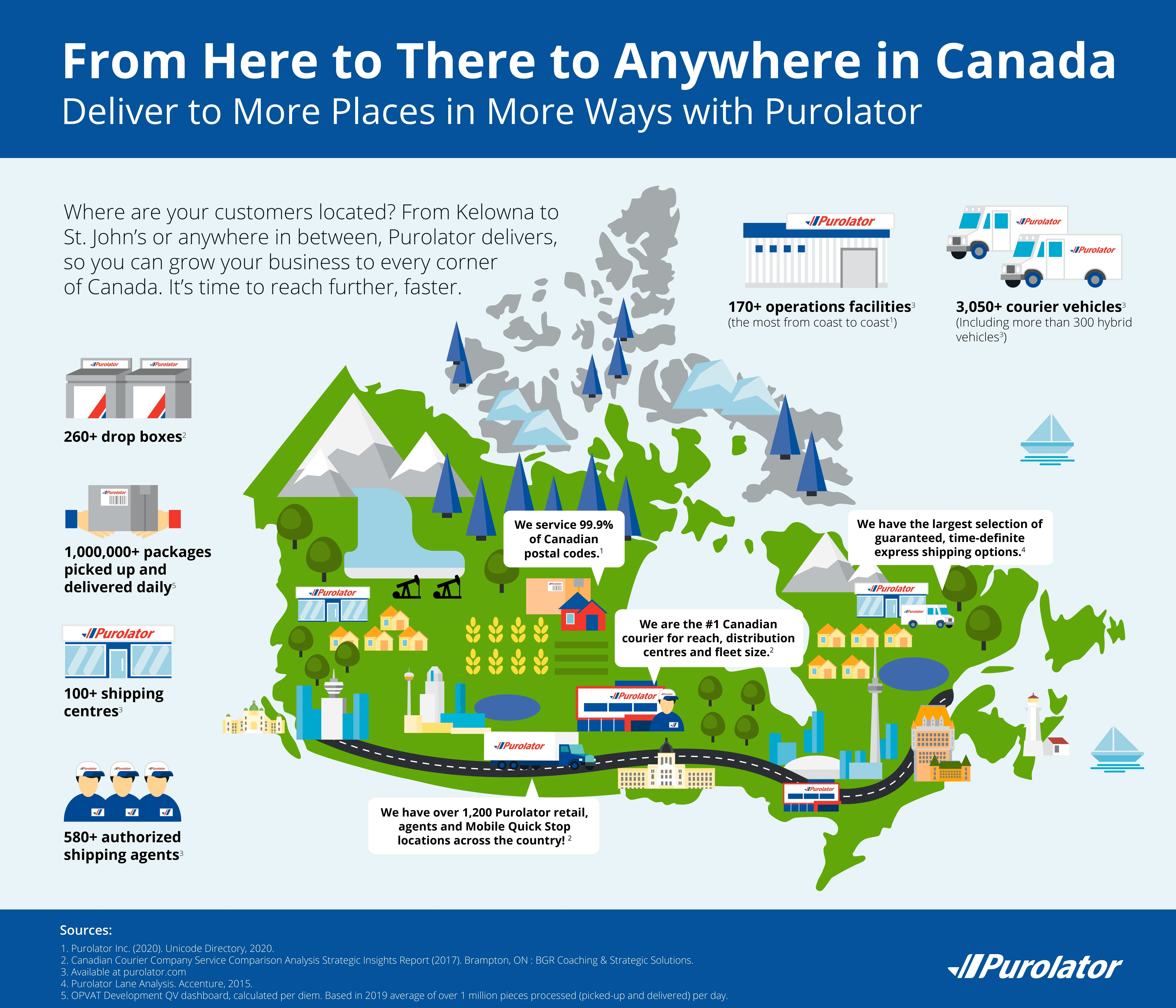 Purolator delivers to 100% of all postal codes in Canada.
