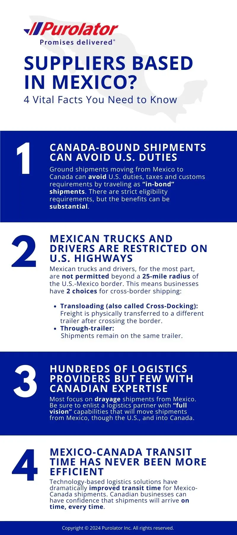 - This is a red flag for Canadian shippers! Be sure to enlist a logistics partner that can manage Mexico-based shipments all the way through to end delivery in Canada.