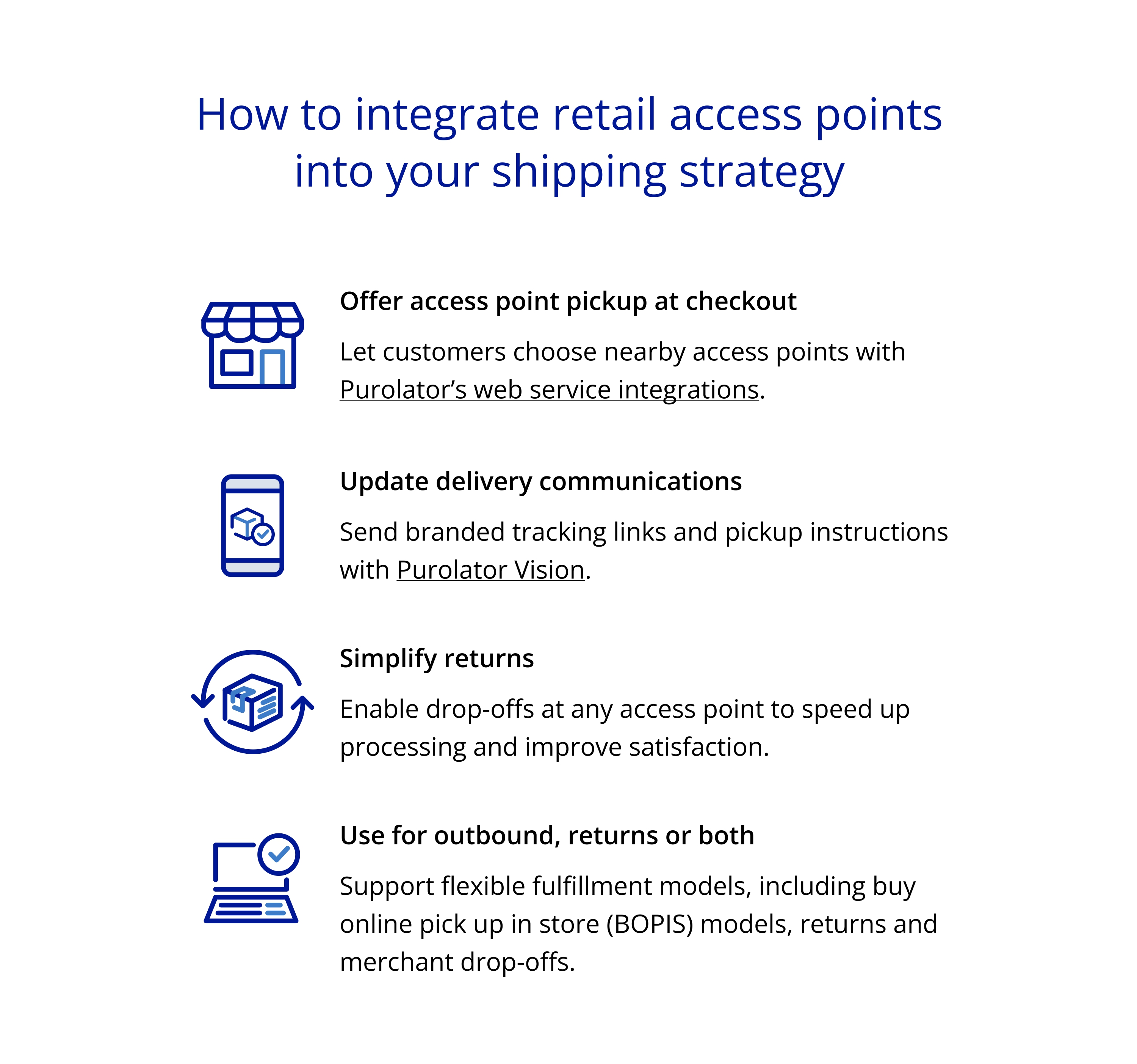 Purolator offers a variety of access point options to meet the diverse needs of Canadian businesses and their customers. These include:
