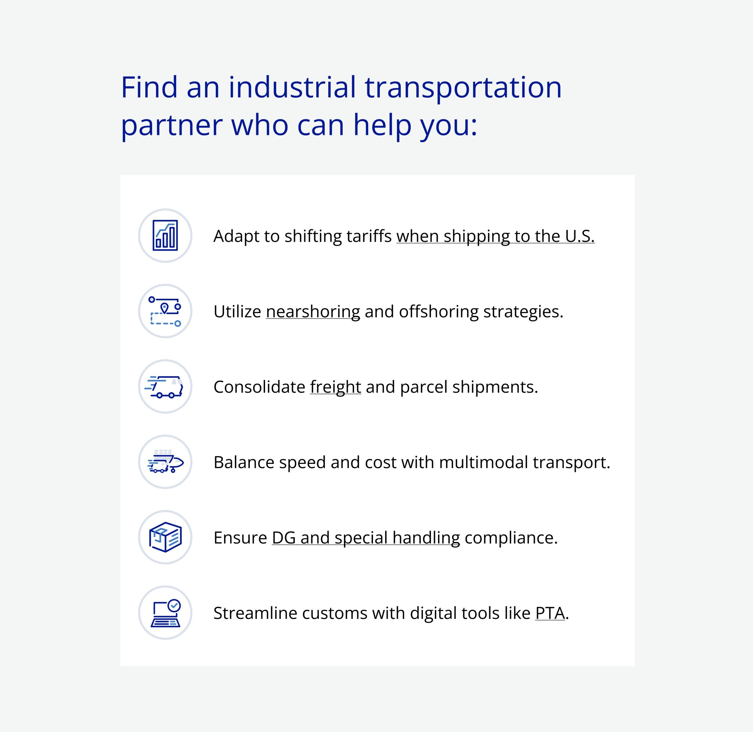 Whether you’re an original equipment manufacturer (OEM), a construction firm, an automotive aftermarket parts distributor, hydraulic equipment supplier or any other kind of industrial manufacturing company, you’re likely familiar with the challenges of shipping machine parts and industrial supplies. Dealing with oversized items, cross-border documentation and compliance can be a lot to juggle on your own. Add in tight delivery windows, and suddenly industrial transport becomes a big challenge without support from an expert.